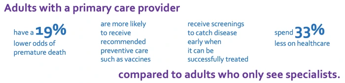 Primary care is your first point of entry into the medical system when you have a new health issue that hasn’t been diagnosed yet, and it’s where you go for preventive care, health screenings, and treatment for chronic conditions. Research has shown that people who have a primary care provider (PCP) are healthier, go to the emergency room less often, and live longer. ‍